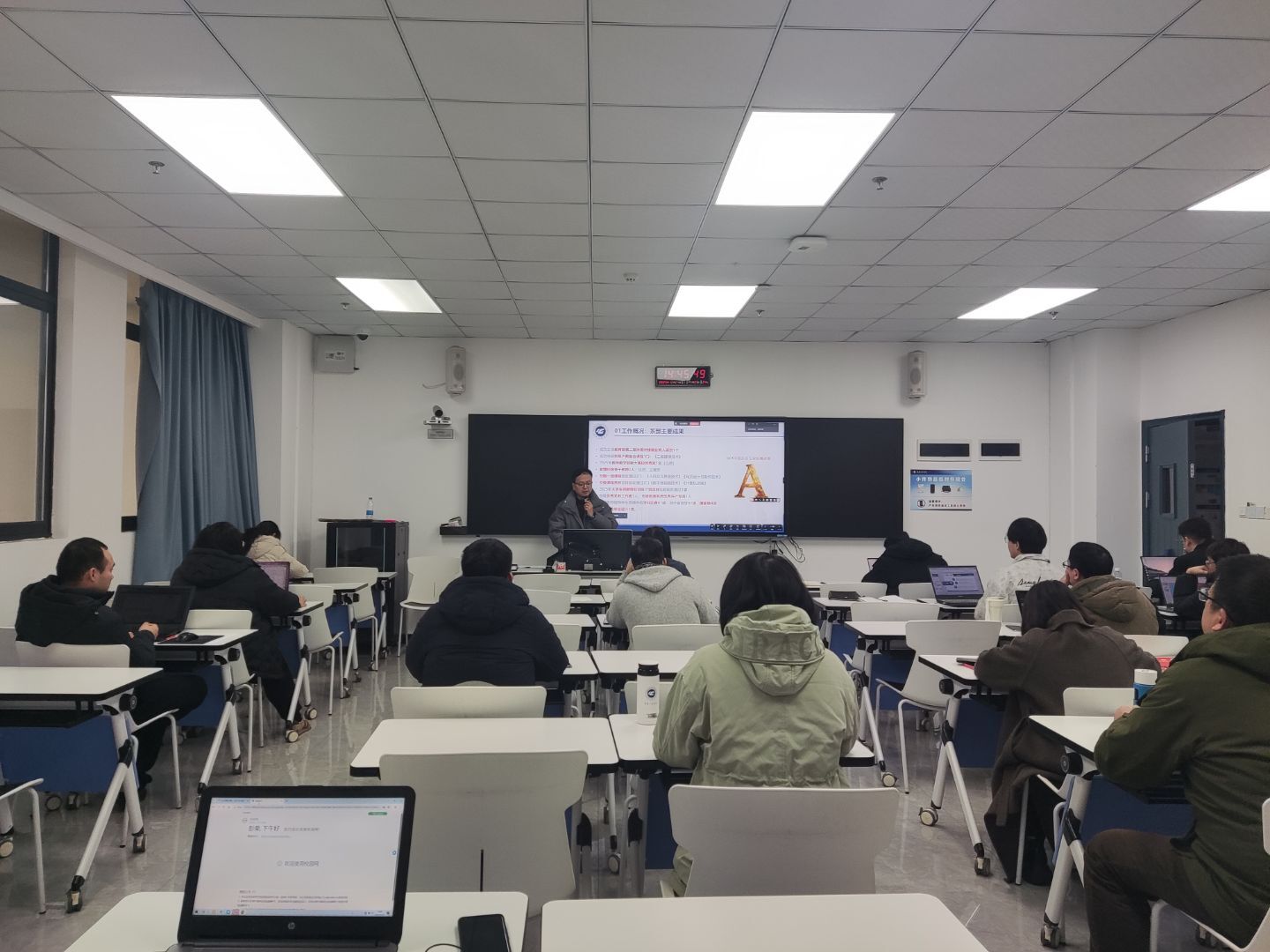 会议伊始,张晓颖简洁阐明了本次总结交流会的核心目的,明确了汇报交流的要求与评分标准。随后,按照既定汇报顺序,全体教职工依次上台汇报,从精心制作的PPT内容来看,系统展示了2025年度的工作成果。汇报中,老师们围绕教学科研、学生培养、校企合作、团队建设等重点工作,全面梳理了个人全年履职情况:在教学上,老师们都顺利完成了学院相关核心课程的教学任务及获得了大部分课程建设成果;在科研领域上,荣获多项校企合作课题顺利结题,部分成果成功转化;在学生培养方面,指导学生参与各类学科竞赛斩获佳绩。同时,老师们也总结分析了个人在工作中存在的不足,并结合学院发展规划,提出了2026年度的个人工作目标与发展思路。